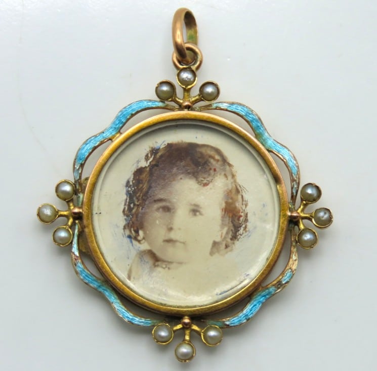 An Edwardian 9ct gold seed pearl set memorial pendant with photo images to front & rear, name of person in images is "Anne", some loss to enamel, 42mm drop, 6.1g £80-100
