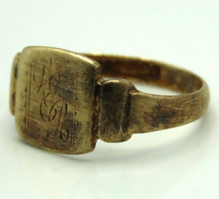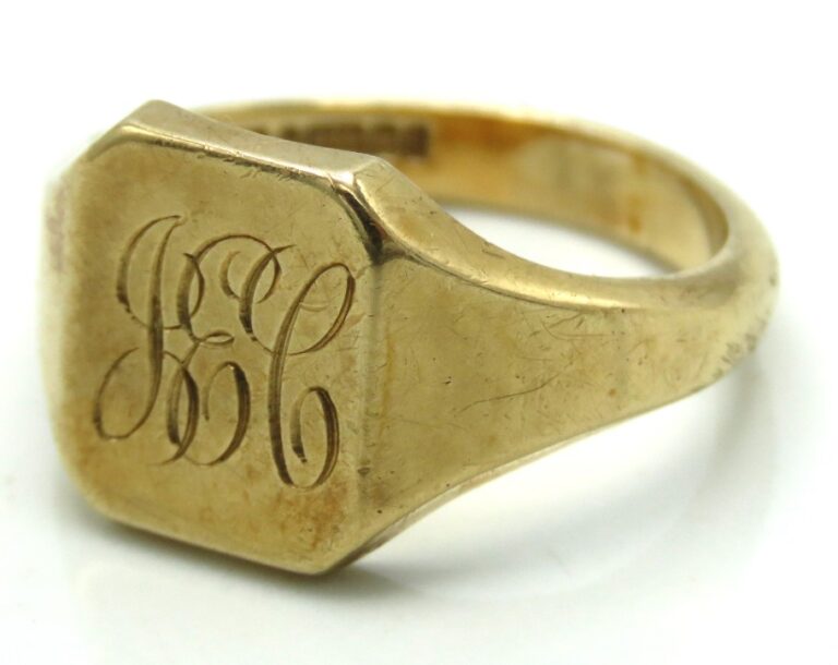 An antique 9ct gold signet ring, some discolouration, misshaping & wear to marks, inscribed "Iris" to rear of head, monogrammed, 3.3g, size Q £80-100