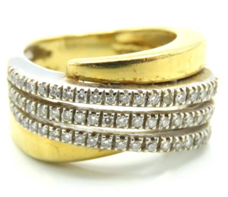 An 18ct yellow gold ring with white shoulder flashes set with an a/f small diamond, 1.4g, size N £80-120