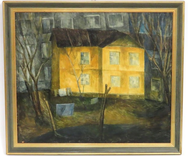 Russian School, 1970s, a follower of Alexandra Exter, an avantgarde oil on canvas of "Yellow House, Moscow", monogrammed & dated '72, image size 590mm x 357mm £60-80