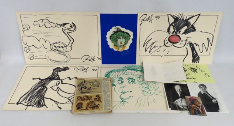 A collection of various sketches & signed drawings originally from the estate of Carol Lee Scott including five by Rolf Harris featuring Road Runner, Sylvester the Cat measuring 594mm x 419mm & "Grotbags" as well as one coloured sketch by Chris Bent of "Grotbags" along with signed Rod Hull & Emu photo & others £100-200