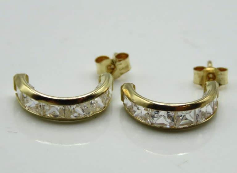 A pair of yellow metal earrings set with paste stones, some soot residue from fire damage, test electronically as 9ct gold, 20mm drop, 1.6g £20-30