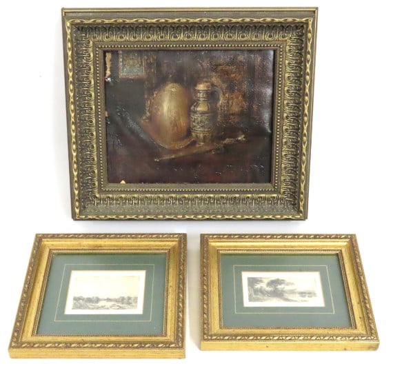 A collection of copper wares including two framed copper pictures by A. Langford & Doreen Edmond, weight excluding pictures 2.3kg £10-20