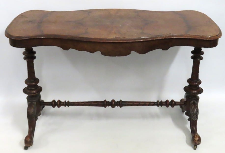 A Victorian burr walnut window table, some lifting to veneer to top, 1220mm wide x 605mm deep x 740mm high £30-40