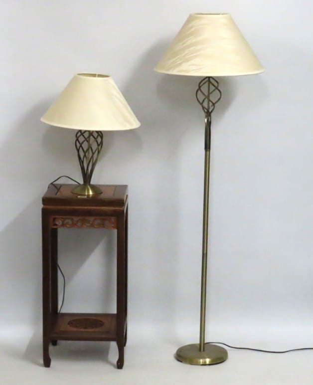 A small modern brass standard lamp twinned with similar table lamp with matching shade (pictured stand is not included), overall heights respectively 1635mm & 570mm £20-30