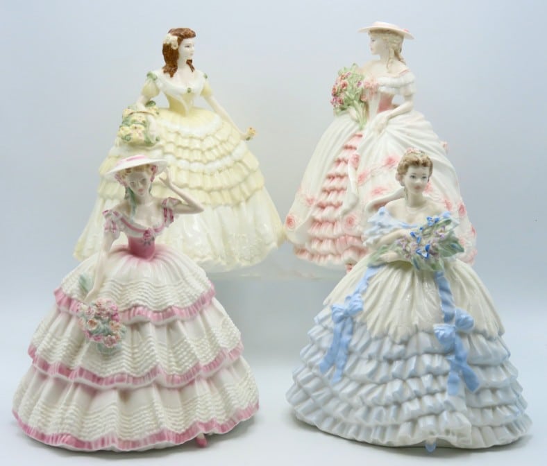 Four porcelain figurines: Royal Doulton Pretty Ladies, Royal Worcester Emily & Coalport True Love 3180/12500 & The Magic of Old Vienna 3801/7500, all with COA, tallest 240mm £50-60