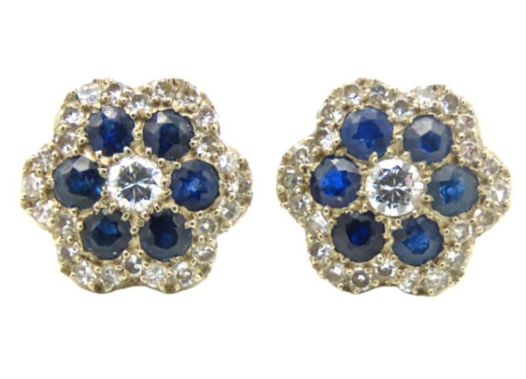 A pair of 18ct white gold earrings set with diamond & sapphire, one lacking a back, 6mm diameter each set with seventeen small diamonds, 1.4g £100-150
