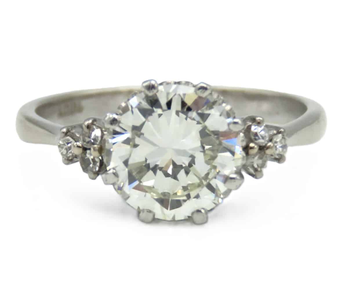 An 18ct white gold ring set with diamonds, centre stone approx. 2.5ct with three smaller to sides, good clarity, no visible inclusions with a x10 loupe, est. colour K/L, 4.4g, size P/Q £6000-8000