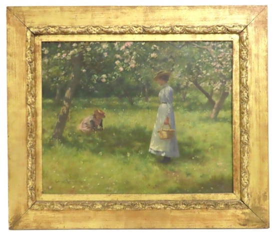 Edwin Harris (1855-1906), an oil on canvas depicting young woman with child within dappled light of English orchard set within it's original frame. The painting has been in the same family since the 1920's. Harris was one of the pioneers of Cornwall's Newlyn school of painters. Image size 500mm x 400mm £10000-15000