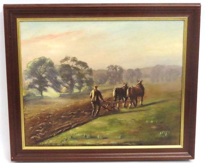 Georges Fiessinger framed oil on canvas "Ploughing Early Morning", image size 495mm x 395mm £60-80