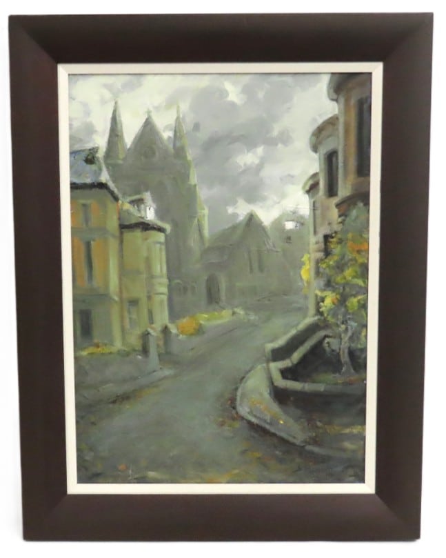 Shahin Memishi, oil on canvas depicting French village street, image size 690mm x 490mm £60-80