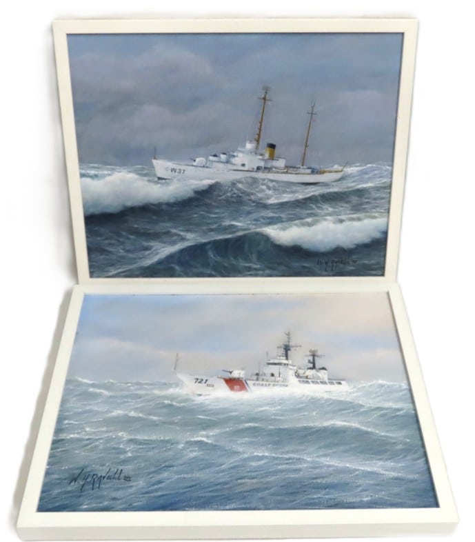 W. H. Ravell (American), a pair of framed oil on canvas paintings depicting US Coastguard boats at sea, image size 495mm x 395mm £60-80
