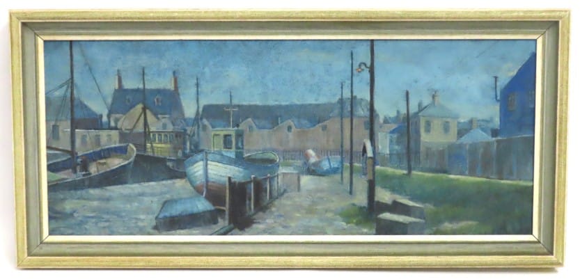 Attributed to Frank Jameson (1899-1968), an oil on panel, possibly St. Ives, depicting boats at harbour, some marks to painting, image size 572mm x 230mm £100-200