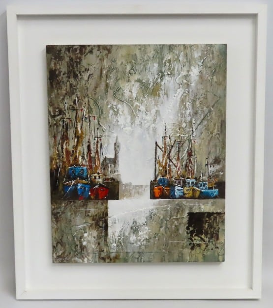David Gray (b.1948), oil on board painting titled "Morning Awakes Fishing Boats", image size 505mm x 405mm £80-100
