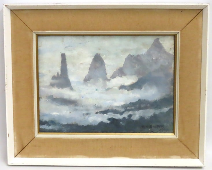 Rudolf Helmut Sauter (1895-1977 German), oil on board painting titled "The Organ Peaks", signed & dated 1929, inscription to verso, exhibit no.22, 1972. Painting bought direct from Sauter himself at Stroud Subscription Rooms, George Room, where he used to exhibit. Image size 320mm x 235mm £100-200