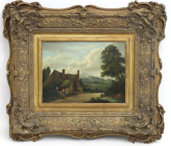 An 18thC. landscape oil on panel in the style of George Arnald (1763-1861), set in decorative gilt frame, small loss to bottom left corner, image size 290mm x 220mm £100-200