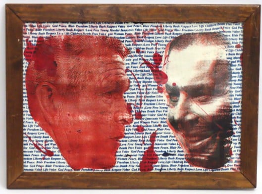 Chris Summerfield, silk screen on canvas titled "War Crimes" featuring images of George Bush & Tony Blair set against mixed text, 480mm x 385mm inclusive £20-30