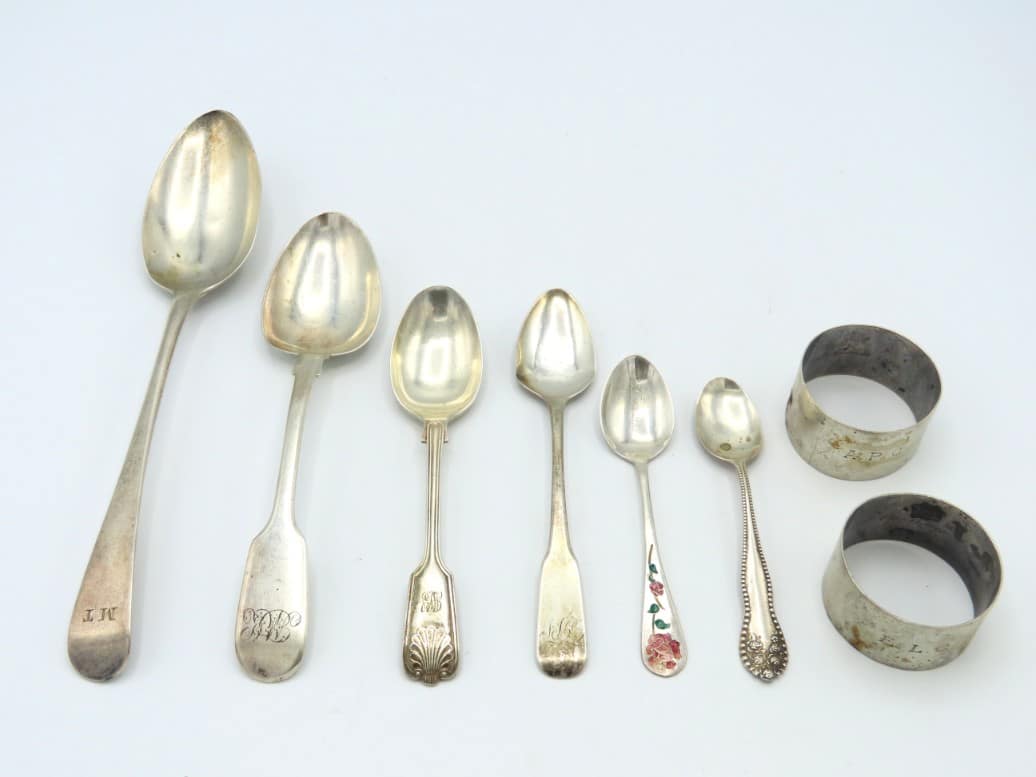 A 1795 George III London sliver tablespoon by Peter & Ann Bateman, a pair of 1908 Edwardian Elkington & Co. silver napkin rings & a selection of mixed silver spoons, including 19thC. 222g £80-100