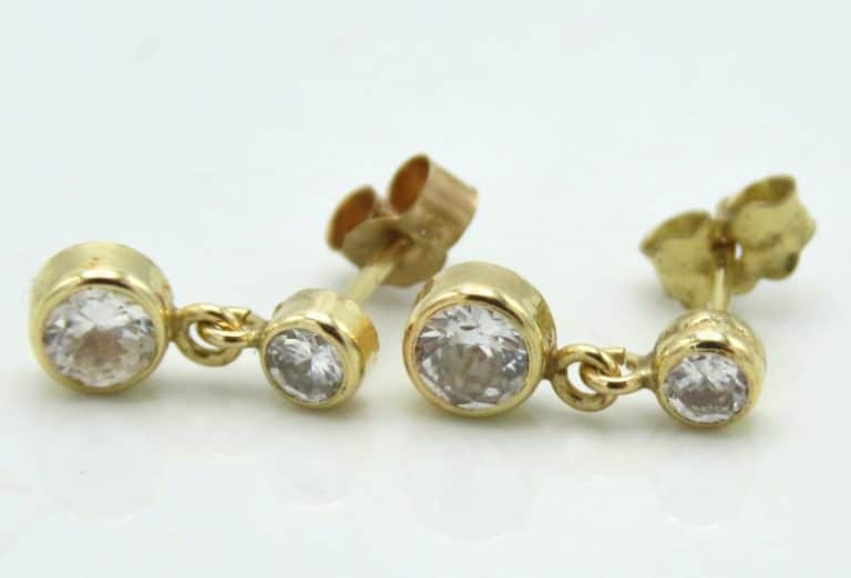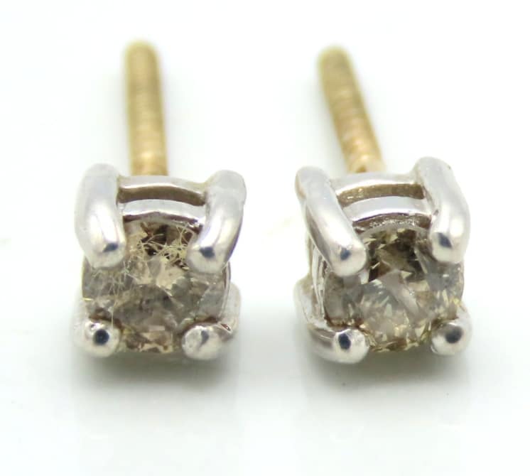 A pair of 9ct gold earrings set with 0.2ct of diamond, stones have inclusions, lacking backs, 0.7g, 3mm diameter overall £20-30