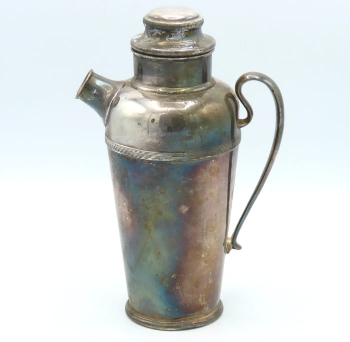 A Harrods cocktail shaker, a/f, a silver plated viners rose bowl, mesh a/f, a plated toast rack, losss of plate, a plated sauce boat, a WMF stylised napkin ring & a Georgian silver teaspoon, 27.5g £20-30