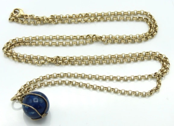 A 9ct gold belcher chain with blue sodalite stone pendant, pendant 13mm diameter, gold weight 14.5g, chain length 700mm £200-300
