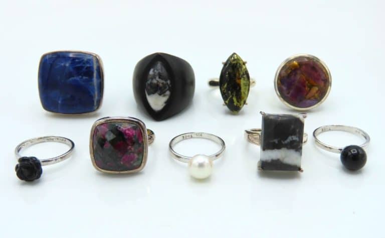 Seven sterling silver rings set with various stones including Tahitian pearl, six size O & one size M/N £30-50